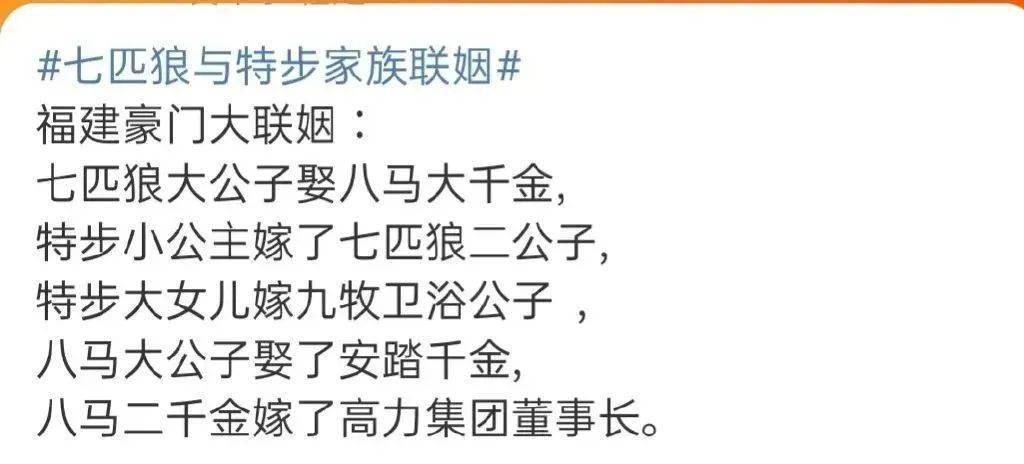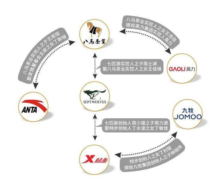 还有网友总结了一下近几年福建当地豪门的联姻情况。粗略地统计了一下,八马家族的三位亲家七匹狼、安踏、高力控股的身家合计超过500亿。而特步家的两位千金又串联起了七匹狼、九牧卫浴家族。 这6大家族的身家至少超过600亿。