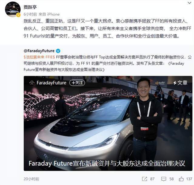 第一,FF Top与FF正式达成了包括重组董事会在内的一揽子治理架构调整协议,FF创始人贾跃亭率合伙人公司成功重组公司董事会;