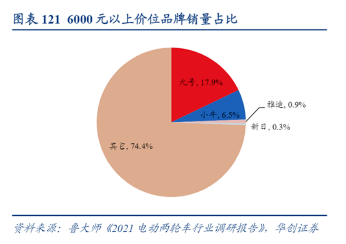 《鲁大师2021年两轮电动车行业调研报告》显示,目前6000元以上价位产品的品牌销量中,九号公司占比为17.9%,小牛电动占比为6.5%;雅迪占比为0.9%;新日占比为0.3%;爱玛未进入榜单。