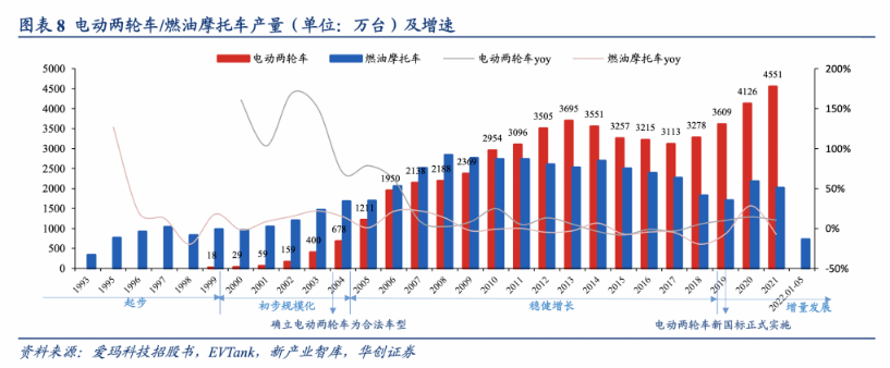 “新国标”实施后,据国海证券研报显示,预计2022-2024年期间两轮电动车将迎来换购高峰,将有上亿台的超标车需要替换。