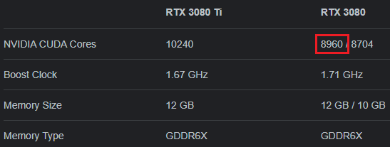 作为对比, 3080 12GB 的 CUDA 核心数量是 8960。