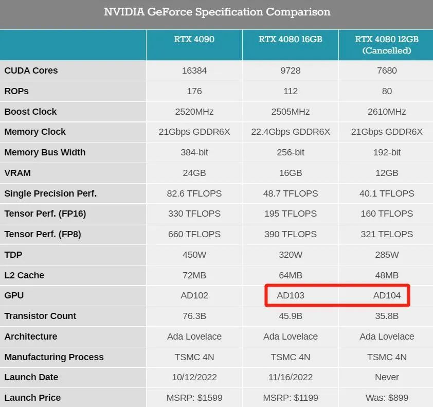 其中最重要的一点就是 GPU 核心不同,4080 16GB 采用 AD103 核心,而 4080 12GB 则是更小的 AD104 。。。