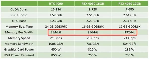 更离谱的是,4080 12GB 的显存位宽也低得可怜,只有 192bit。