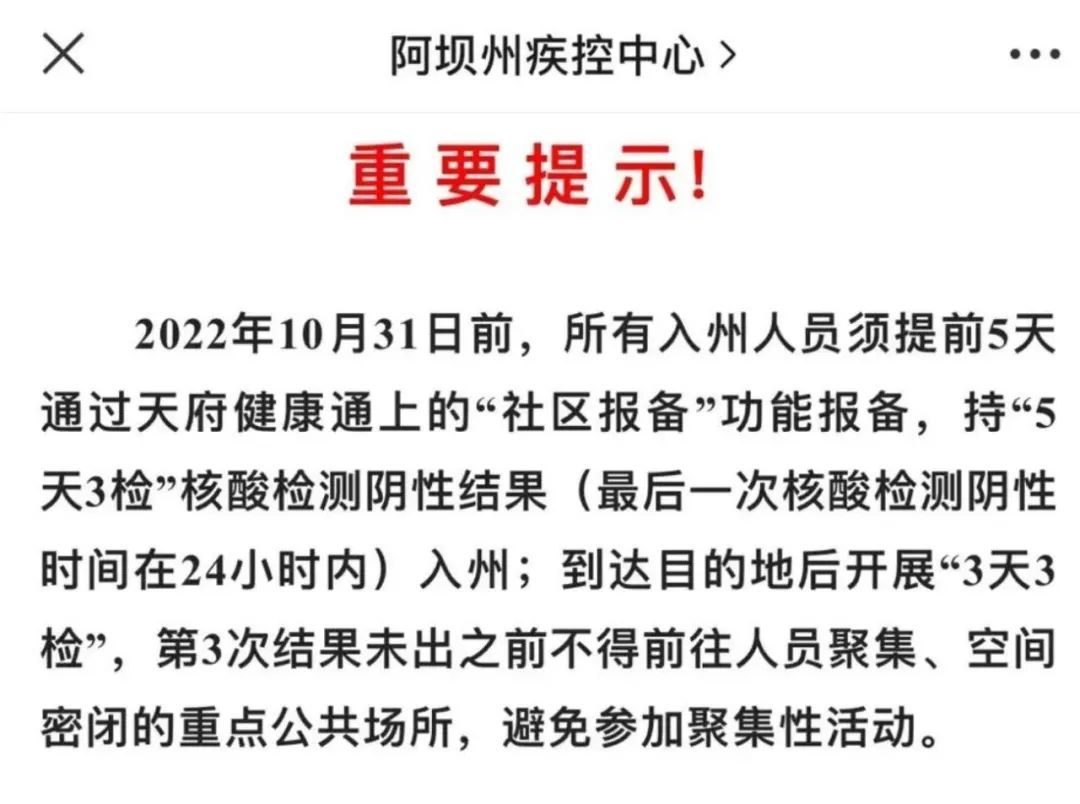 在徐诗沐看来,这无异于一场劝退,“比如几个知名景区各自为战,九寨沟要求九寨沟县的三天三检方可购票,四姑娘山要求小金县的三天三检,黄龙要求松潘县的三天三检,游客怎么可能做到呢?”