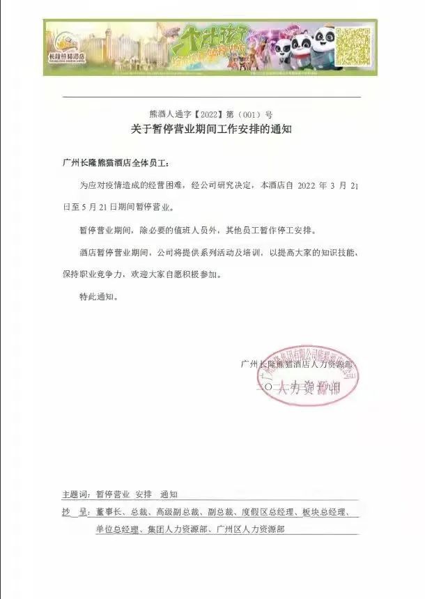 一封熊猫酒店员工转发旅界的《关于暂停营业期间工作安排的通知》显示,广州长隆熊猫酒店暂停营业期间,公司将提供系列活动及培训,以提高员工的知识技能,保持职业竞争力。