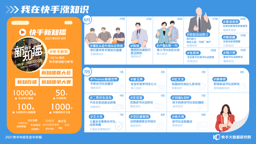 作为短视频领域的竞争对手,快手在知识内容的开发上同样煞费苦心。快手从“教育生态合伙人计划”到光合演讲,再到联合知乎发布“快知计划”,随后又进一步升级打造了“光合新知新职”计划,推出大型直播活动“快手新知播”等。