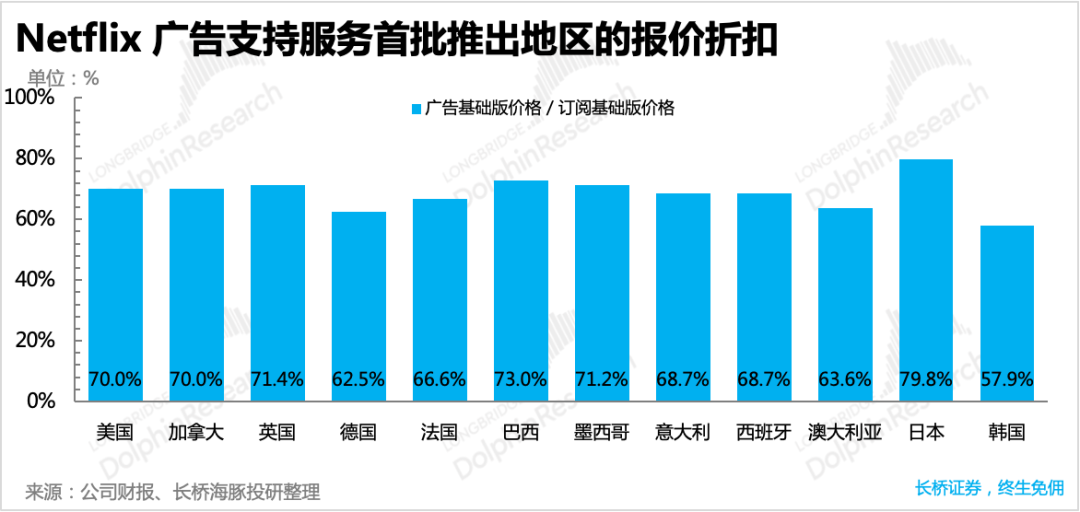 在此次上线的12个国家/地区中,广告套餐的定价差不多在基础版套餐定价的6-7折。细微差别在于,用户对于广告接受度较低的国家地区,打折力度更大一些。