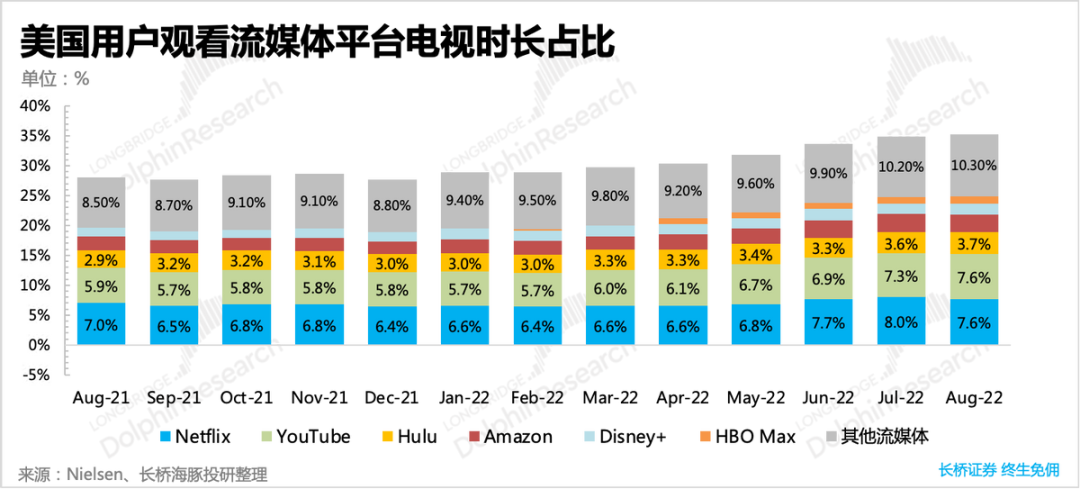 2)在美国,奈飞贡献了7.6%的电视观看时长,是Amazon的2.6倍,Disney+Hulu的1.4倍。