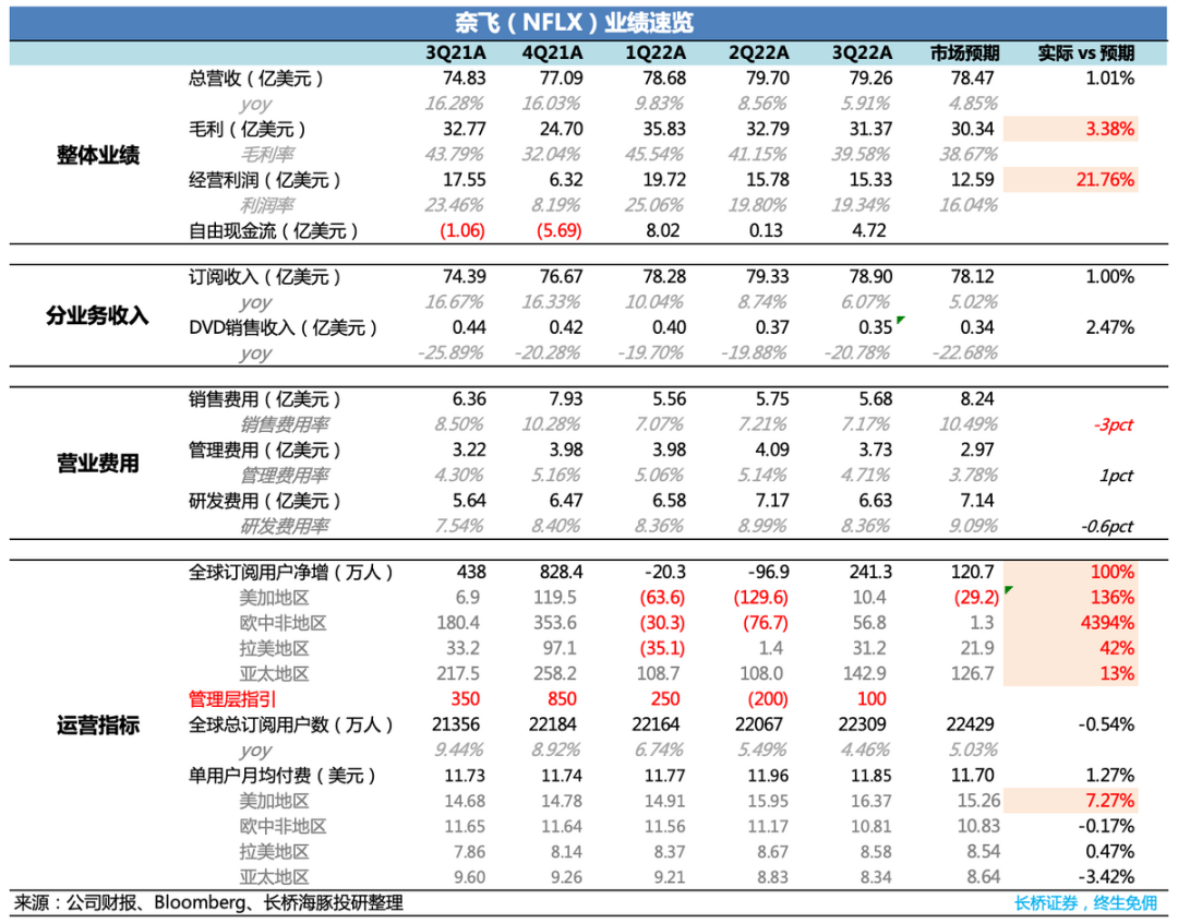 三季度奈飞全球订阅用户为2.23亿人,环比净回流241万,增长情况好于管理层指引和市场预期(~100万),在接连两个季度逊于预期后,尽管有多部爆款剧集,但市场出于对宏观经济下行担忧,原本对奈飞的三季度增长预期比较保守。