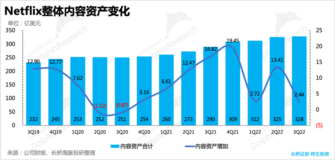 1)截至三季度末,奈飞内容资产整体规模328亿,相比上季度仅小幅增加了2.4亿。