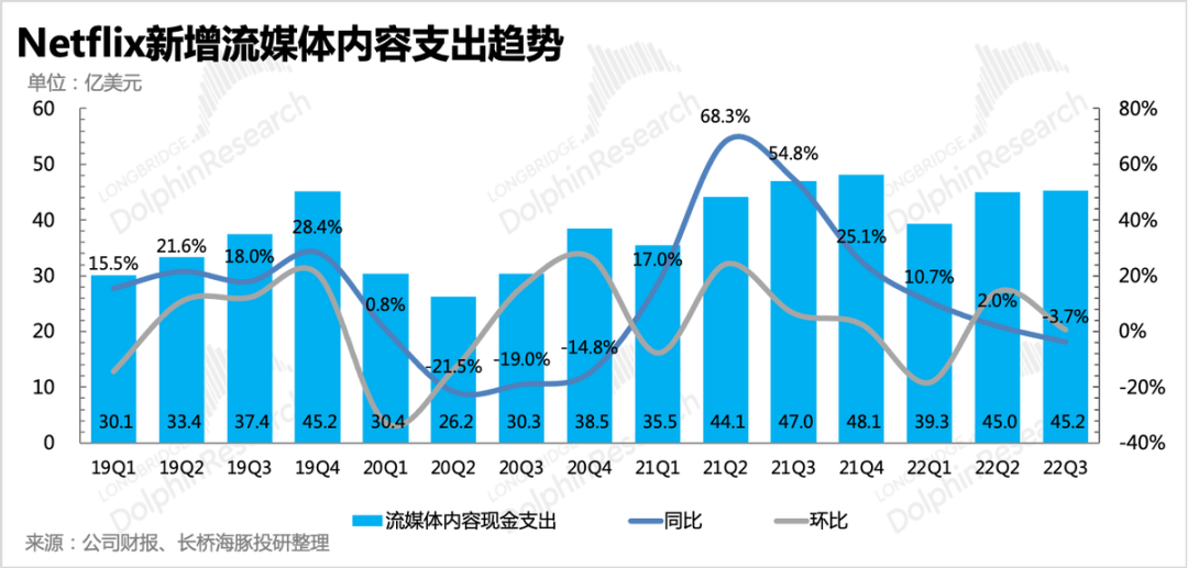 海豚君认为,从行业竞争加剧(内容成本增加、收购重组费用增多)和广告支持服务上线初期(相关推广开支、调整付费模型的费用支出增加)的角度来看,奈飞未来的成本开支只会多不会少。三季度费用环比降低的情况,并不能代表常态。