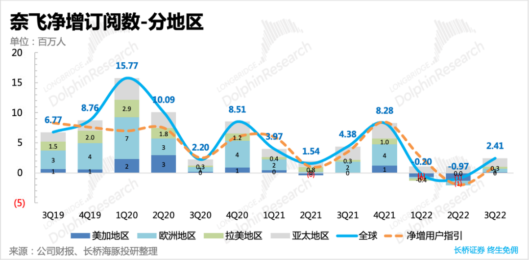 (1)总收入同比增长6%,主要受订阅用户数的增长驱动,尤其是亚太地区,一直在全球用户规模扩张的主力军。但三季度由于优质内容吸粉,欧美等成熟地区回流了一些用户,这是与市场主要的预期差所在。