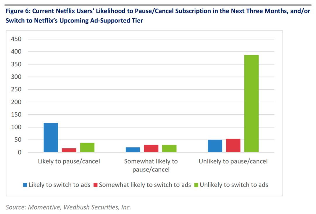 2)而目前现有的短期没有取消订阅计划意愿的用户中,大部分用户不会因为有更便宜的广告套餐,而“向下”调整自己的付费方案。