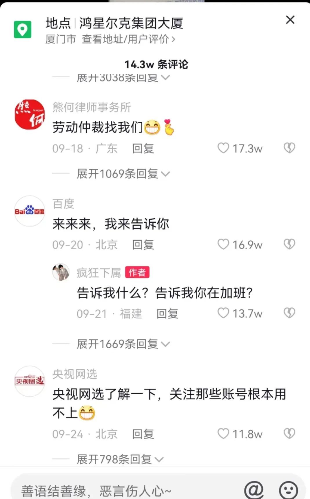 此外还有不少其他公司的官方账号纷纷来到评论区:有挖人的,有主动提供劳动仲裁帮助……各路官方的加入不仅增加了故事的精彩程度和话题的持续性,同时这种趣味性有利于增加用户转发分享的欲望。