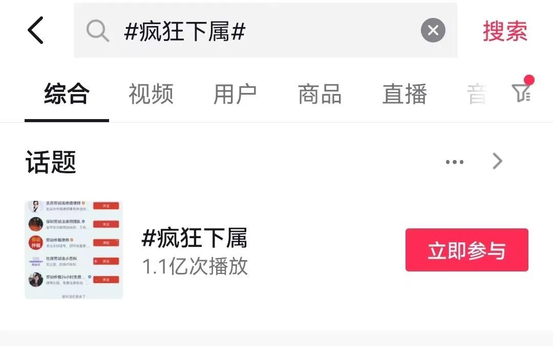 在这些整顿职场的故事中,00后这类群体逐渐被贴上反对加班文化、坚决抵制内卷、不惧领导权威、更加关注劳动权益的标签。而“疯狂下属”则用视频的形式让用户更加具象、沉浸式地感受00后的鲜明个性。不仅仅是在内容中时时刻刻贯彻着“鸿星尔克也需要整顿”的flag,而且在关注列表里还躺着一堆专攻劳动权益的律师团队,“劳动仲裁24小时免费咨询” “劳动仲裁律师”,甚至还有大名鼎鼎搞刑事案件的罗翔老师,大有将“疯狂”进行到底的意味。