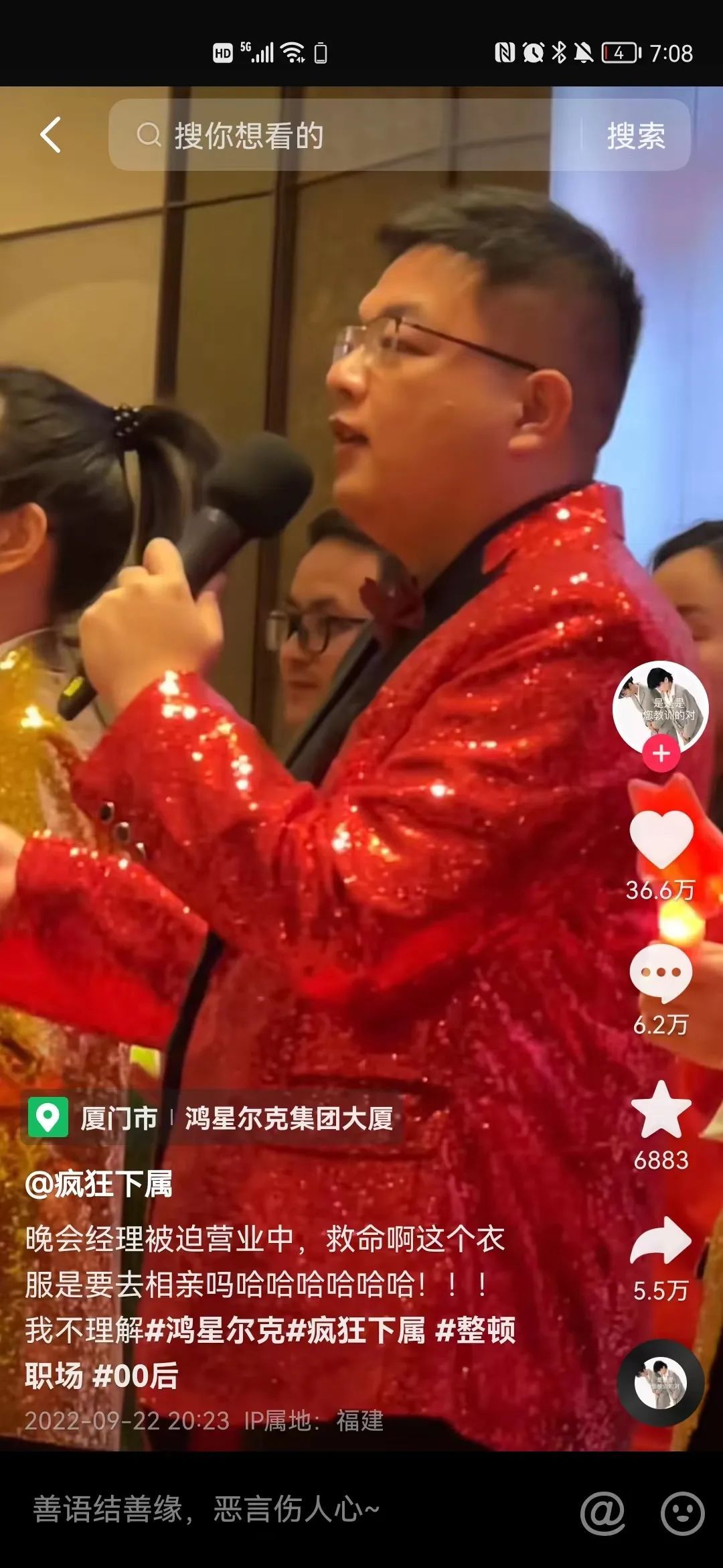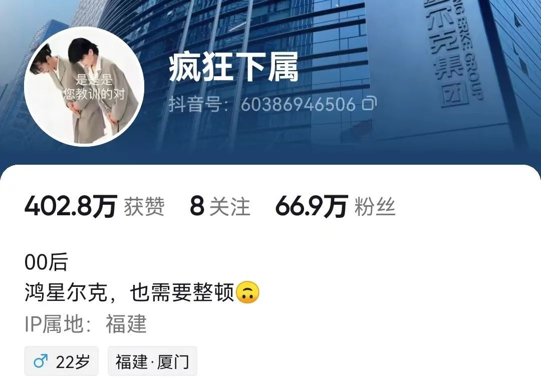 9月,一位名为“疯狂下属”的账号在短视频平台横空出世。TA用着最谦卑的头像“是是是,您教训的对”,却在个人简介里叫嚣着“鸿星尔克,也需要整顿”,并爆出了一堆职场黑料。
