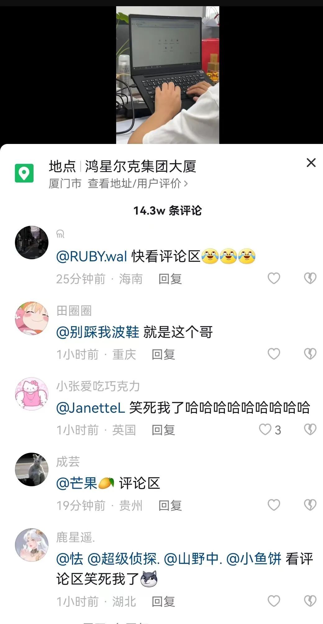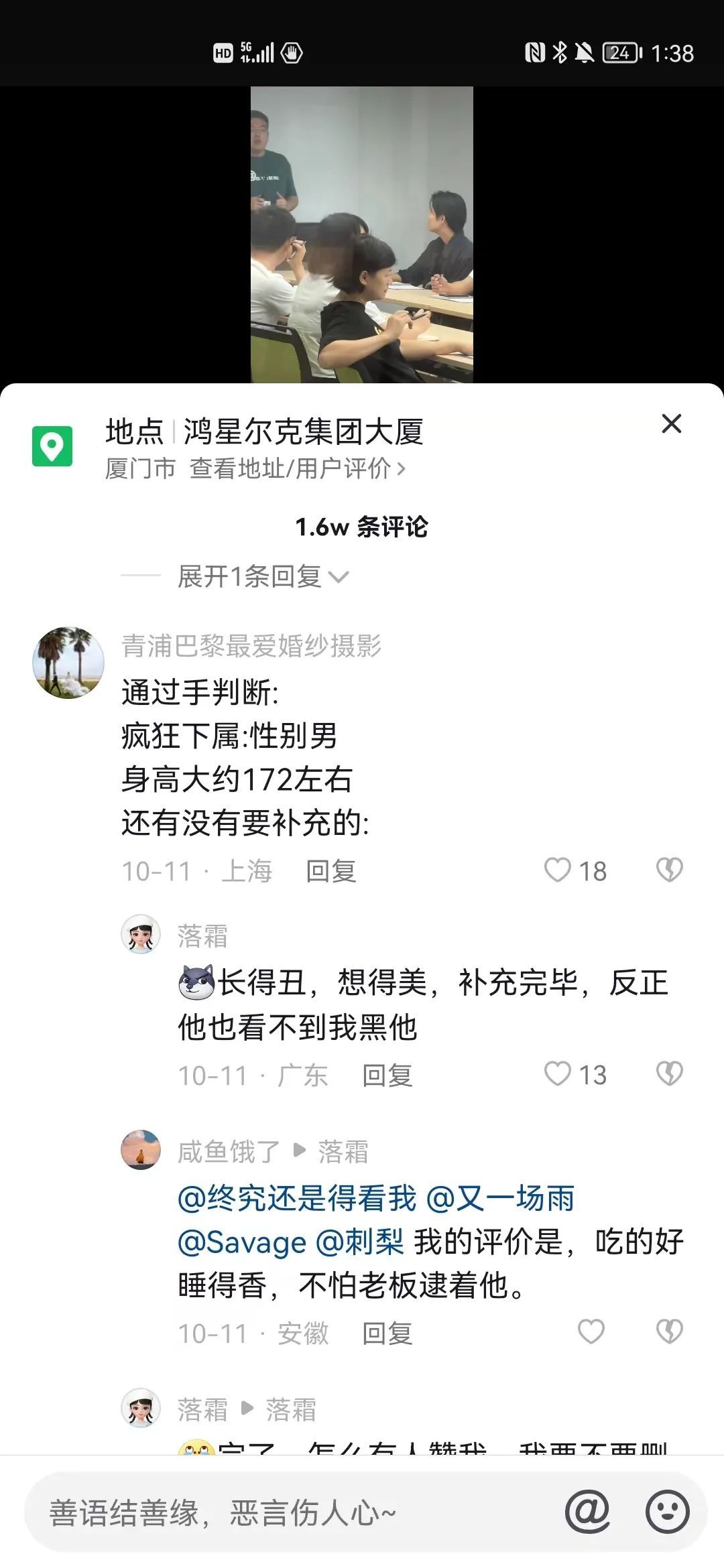 甚至还引起了老总的注意,在鸿星尔克的双11启动会上,老总吴荣照直接表示因为疯狂下属的出现这两天都没睡好觉,还特意跑去看了一下,果然名不虚传。也去了账号下面留言,“小伙子不错,小小年纪有胆识。有空来我办公室,给你泡茶喝”。