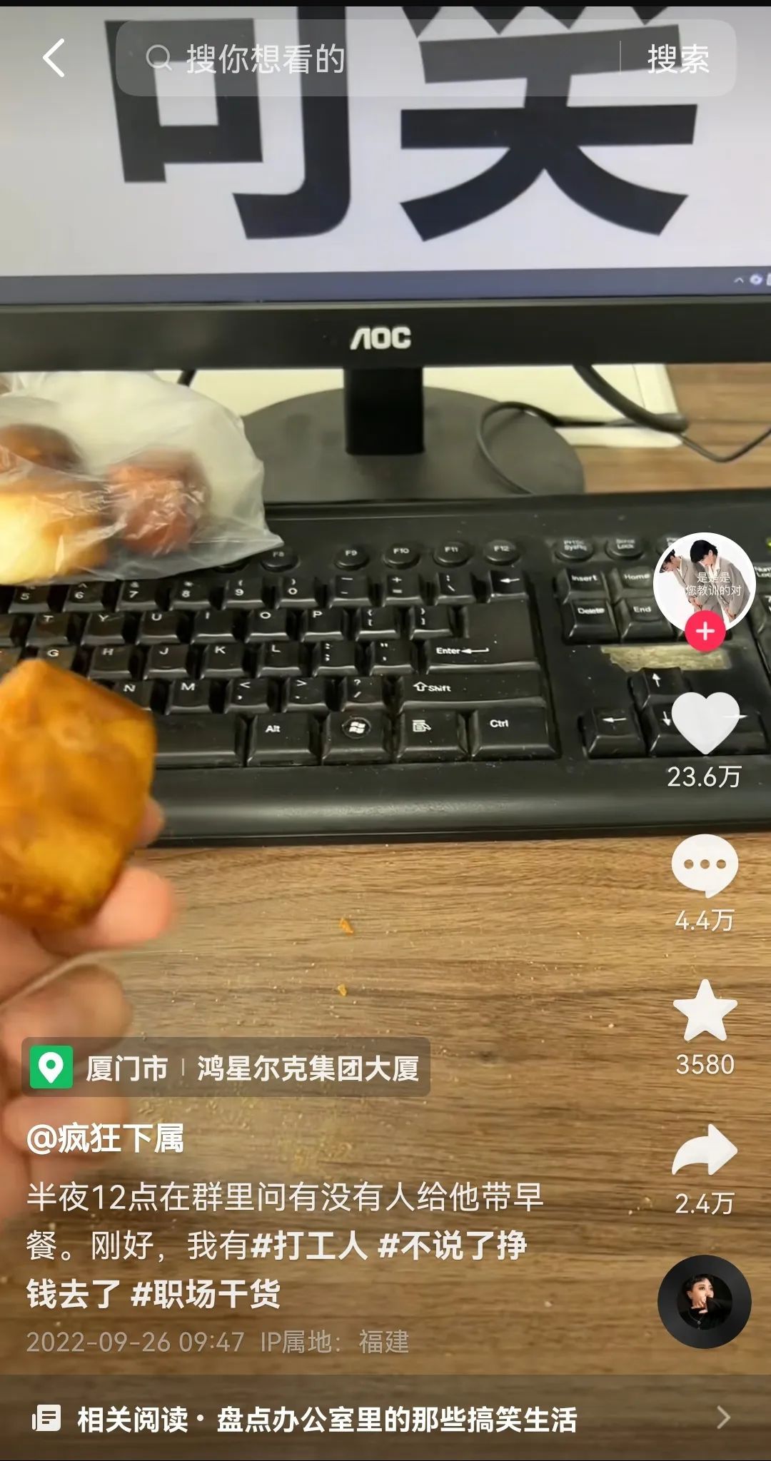 在短视频平台上,从来不缺少表现职场日常的作品,这些视频中的主人公大多塑造的是认真工作的积极人设,而同为职场人的“疯狂下属”则一反常态,在他所发布的十个作品中,有偷拍大家摸鱼、吐槽整蛊上司、下班放假最积极……再加上TA略带狂气的简介,在无形中树立起了自带“反骨”的职场后浪人设。与前一段时间在各大社交平台流行的00后整顿职场的话题狂欢不谋而合。