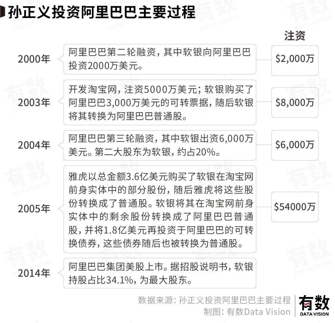 2000年,软银继续押注阿里,参加了第二轮融资注资8000万美元,并在2003年拿出资金帮助阿里建立网商的门户网站——淘宝。孙正义对阿里巴巴的支持之慷慨,令竞争对手们不寒而栗。