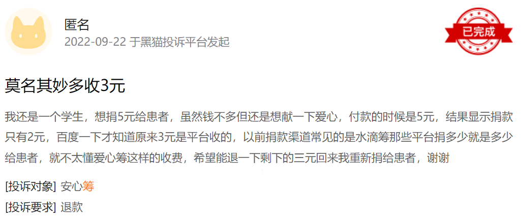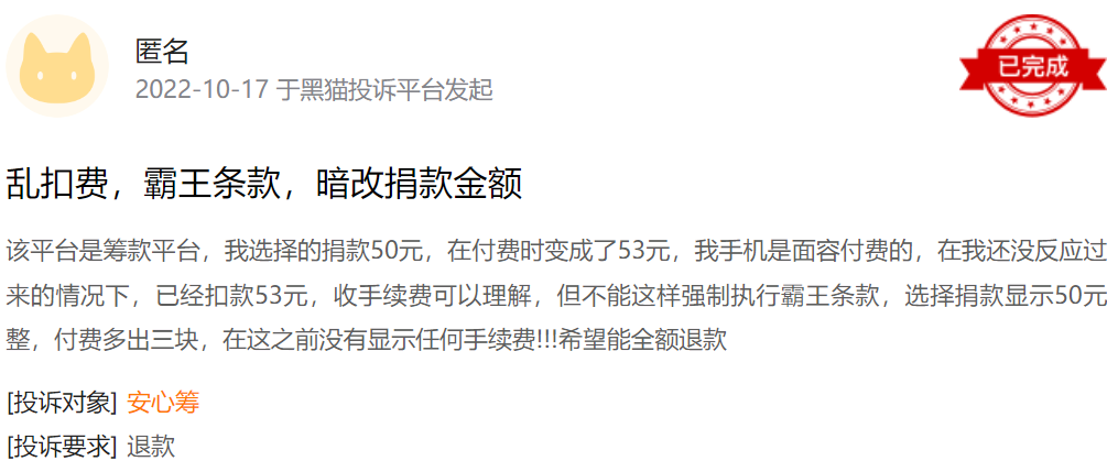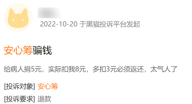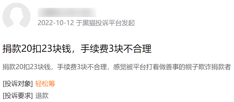 在黑猫投诉上,有人捐 20 块,被扣了 23 块。