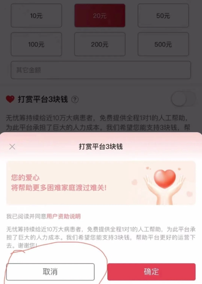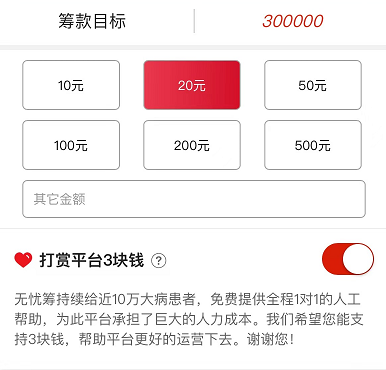 以「 无忧筹 」为例,此前用户捐款时,会默认打赏平台。 ( 现在已经改了 )