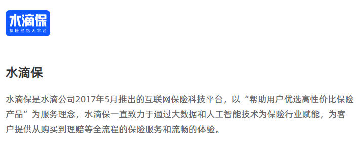 水滴保是水滴集团的第二大业务,简单来说,其实就是卖保险,它负责把各大保险公司的保险产品卖出去,赚个佣金。