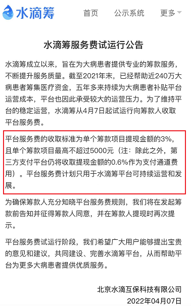 他们向筹款人收取服务费,收取额度为单个筹款项目提现金额的 3%,且单个项目最高不超过 5000 元。