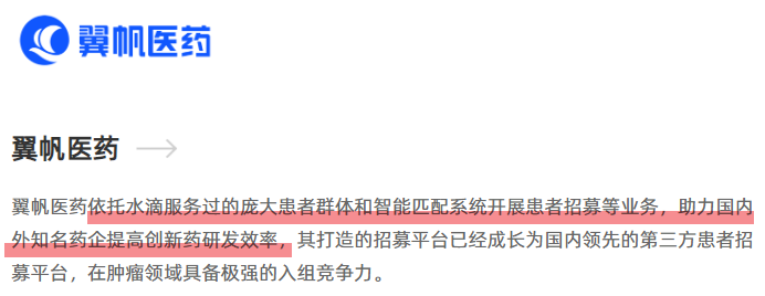 翼帆医药主要代表着医药服务,主要是通过跟制药公司合作,替他们招募患者参加临床试验。