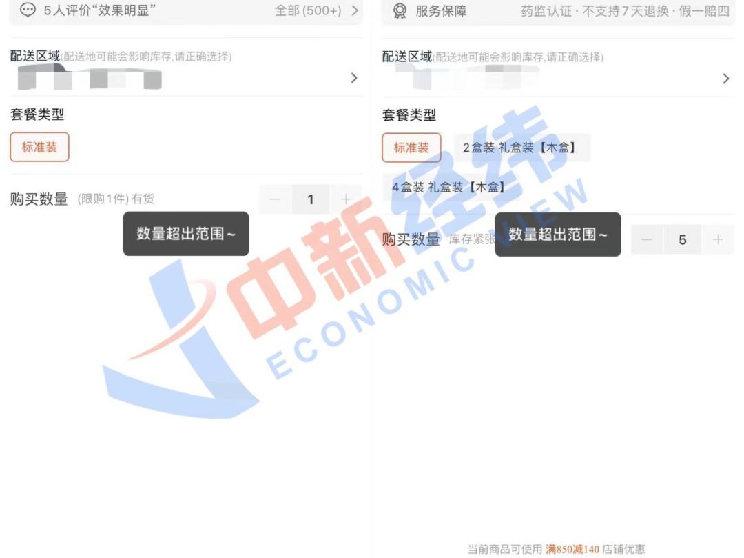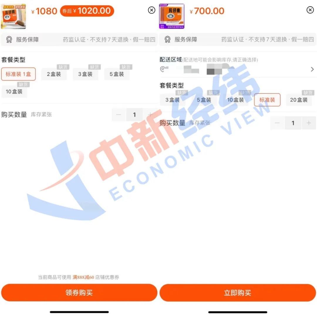中新经纬同时发现,部分商家的3盒装、5盒装、10盒装、20盒装已显示缺货,只能购买标准装,即1粒装。