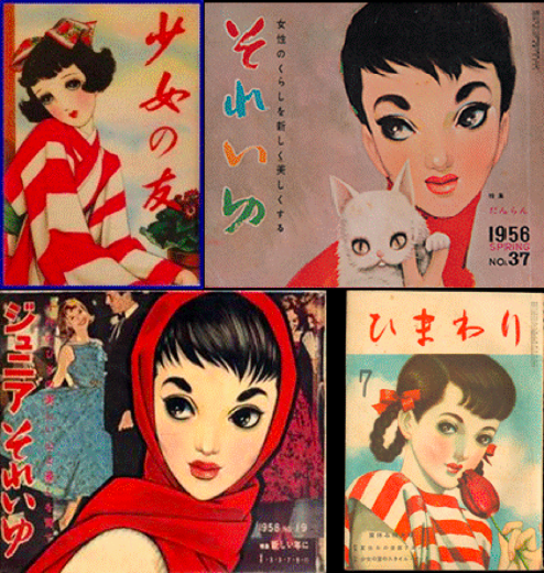 1920年代开始活跃的中原淳一喜欢法国玩偶娃娃,他画的封面插图也都有着精致的大眼睛和卷翘睫毛,影响了不少当时的少女漫漫画家。