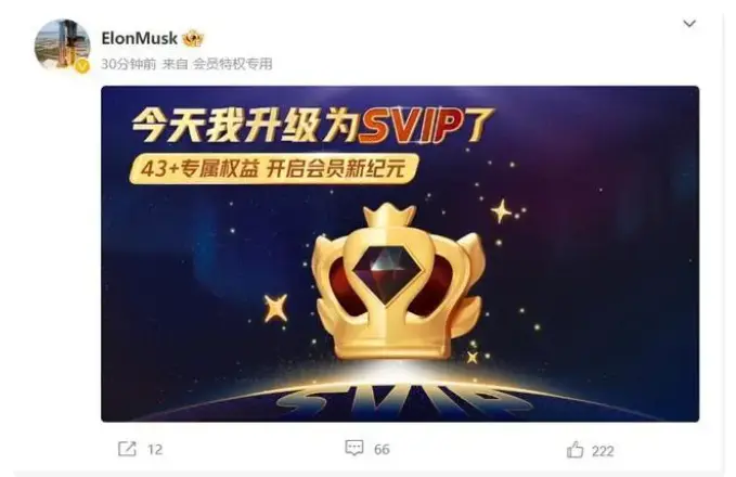 就在几个小时前,马斯克在微博表示“已成为SVIP用户”,这是微博5天前刚公布的付费进阶会员服务。