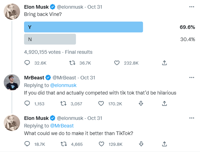 10月31日,推特新任CEO伊隆·马斯克(Elon Musk)向网友发起民意调查:要不要“复活”短视频应用Vine?