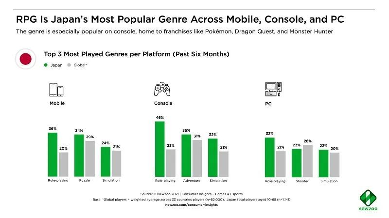 而RPG游戏是日本玩家最喜爱的游戏类型,46%的玩家近半年来玩过RPG游戏,全球平均值仅为23%,而战术竞技类游戏仅有24%的玩家玩过,射击游戏仅有23%。