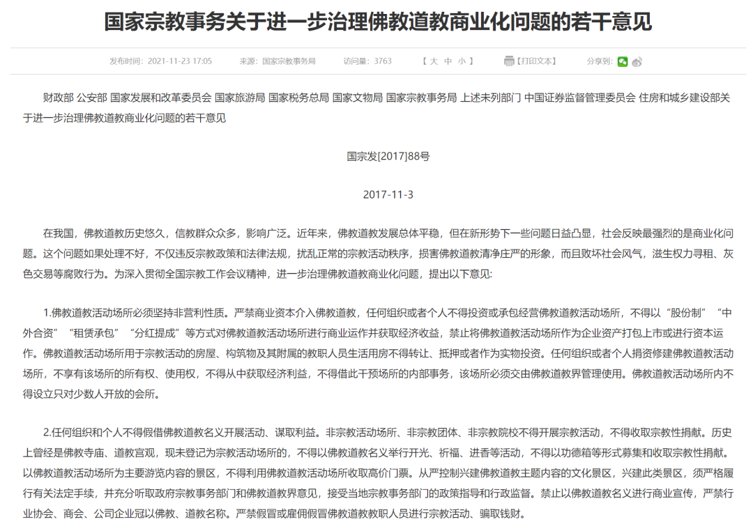 或许是乱象过于杂乱,国家宗教局联合多部门下发《关于进一步治理佛教道教商业化问题的若干意见》开始生效。其中《意见》里,明确禁止投资,承包经营宗教活动场所,为愈演愈烈的寺庙商业化乱象,及时纠偏。