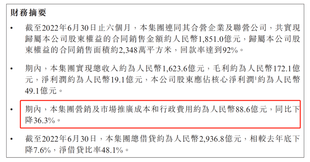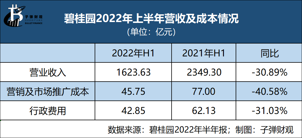 值得一提的是,在这份半年报的财务摘要(一般都在展示财务亮点)中被碧桂园重点引述的一点:“营销及市场推广成本和行政费用同比下降了36.3%”。乍一看“降成本”的效果比较明显,毕竟上半年的营收下降了30.89%,这两项成本却是下降了36.3%。