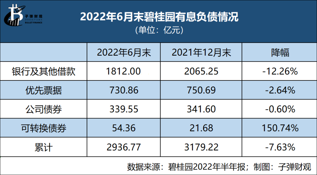 而在这份财报中的另外一点被重点引述的是总借贷(有息负债)有所下降。碧桂园在这份半年的财务摘要中提到:“截至2022年6月30日,本集团总借贷为人民币2936.8亿元,相较去年底下降7.6%”。