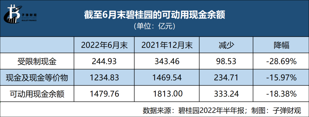 其次,这1234.83亿元的非受制现金余额,相比于2021年末减少了234.71亿元,下降幅度为15.97%。受限制现金降幅虽有28.69%的下降,但这笔钱因暂时无法使用,已失去现金流的灵活性的特质,面对流动性压力也是无济于事,况且也只是减少了98.53亿元。