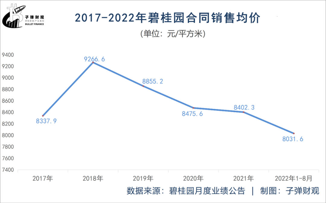 到2021年碧桂园的销售均价已下降至8402.3元每平方米,回到了2017年的均价水准。而从2022年的前八个月数据看,碧桂园的销售均价进一步下滑至8031.6元每平方米,甚至比2016年的销售均价还要低。