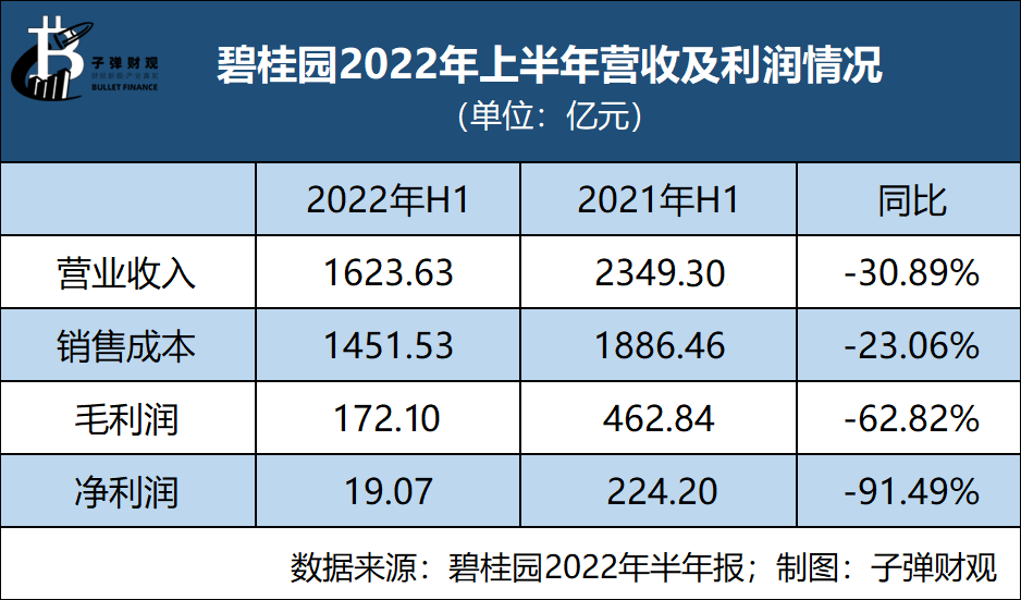 碧桂园2022年半年数据显示:截至6月末,碧桂园实现营业收入1623.6亿元,同比下降30.89%;销售成本1451.53亿元,同比下降23.06%;毛利润约172.1亿元,同比下降62.82%;净利润约19.1亿元,同比下降91.49%。