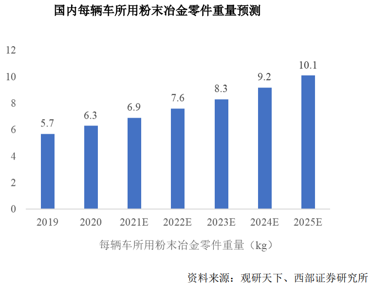 根据西部证券研究所分析模型,假设2025年每辆汽车的粉末冶金零件使用量为 10.1kg,并假设2022-2025年国内汽车产销量近似持平,那么整个下游将需要 30.30万吨的粉末冶金零件。假设汽车粉末冶金零件价格维持不变,为4万元/吨,到2025年,中国汽车粉末冶金零件市场规模将达到121.2亿元,2020-2025 年年均复合增长率为13.77%左右,粉末冶金汽车零件市场空间巨大。
