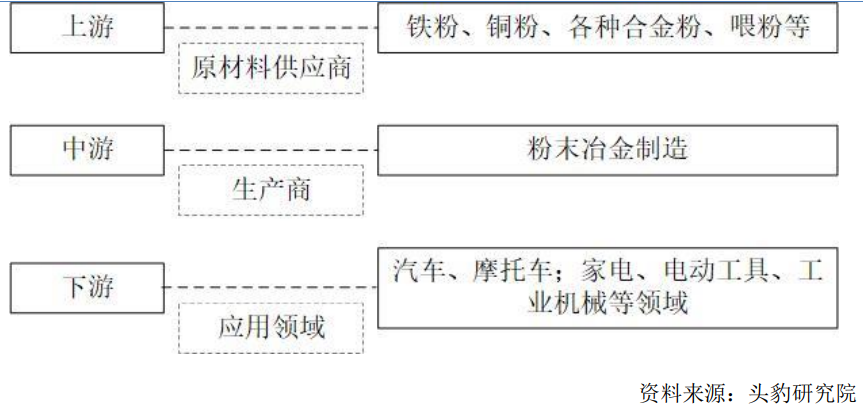 从粉末冶金零部件行业的产业链来看,上游为金属粉末等材料行业,下游为汽车、家电、电动工具、机械等行业,粉末冶金制造业属于典型的中间加工制造业。而公司就属于中游产业链的加工制造业。
