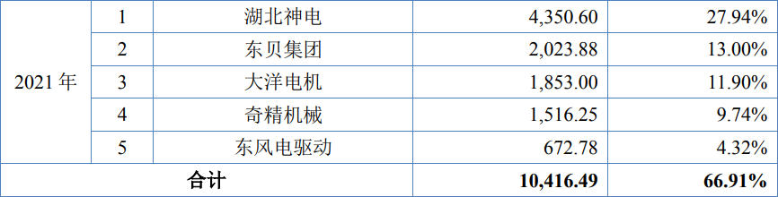深耕于粉末冶金材料,九菱科技绑定了多家下游知名汽车电机及零部件客户。2021年公司前五大客户分别是湖北神电、东贝集团、大洋电机、奇精机械、东风电驱动。