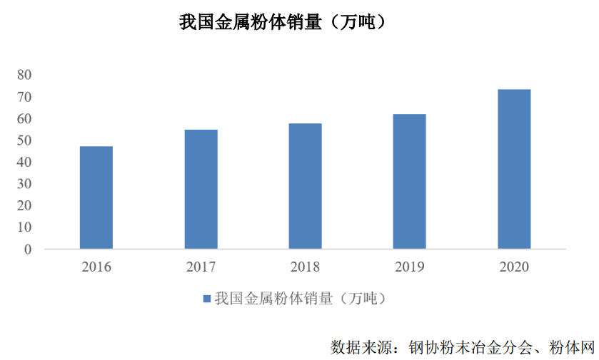 另据中国钢协粉末冶金分会统计数据显示,中国金属粉体销量从2016年的 47.22万吨增加到2020年的73.61万吨,期间复合年均增长率为11.74%。未来随着粉末冶金零部件在新兴领域的运用,中国粉末冶金行业市场规模有望持续增长。