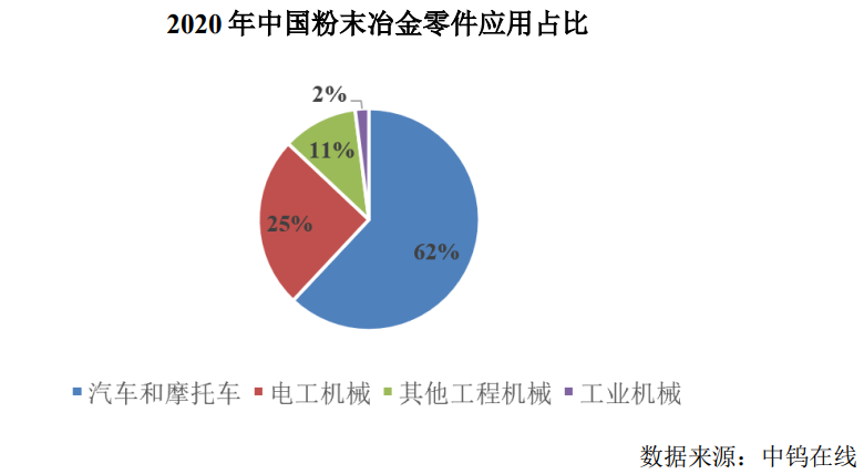 近年来,随着交通、机械、电子等行业的稳步发展,对粉末冶金材料的需求也呈现平稳增长趋势。根据中钨在线数据显示,2020年我国粉末冶金零件在汽车和摩托车应用占比约为62%。