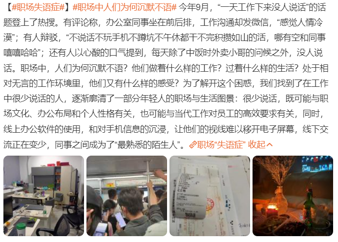 #职场中人们为何沉默不语#的话题上了热搜,随之而来的是一个莫须有的话题#在办公室工作干一整天活却没有说一句话,真的是人情冷漠吗?#