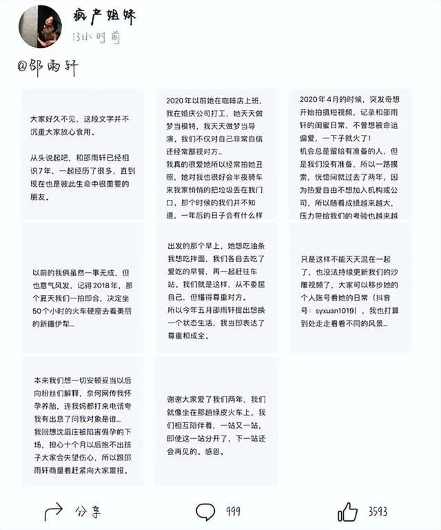 无独有偶,疯产姐妹原本是由姐妹二人运营的IP。但在慢慢走红后,因为利益分配不均两人分手。核心成员之间产生矛盾,对没有团队维护的“疯产姐妹”来说影响是巨大的。