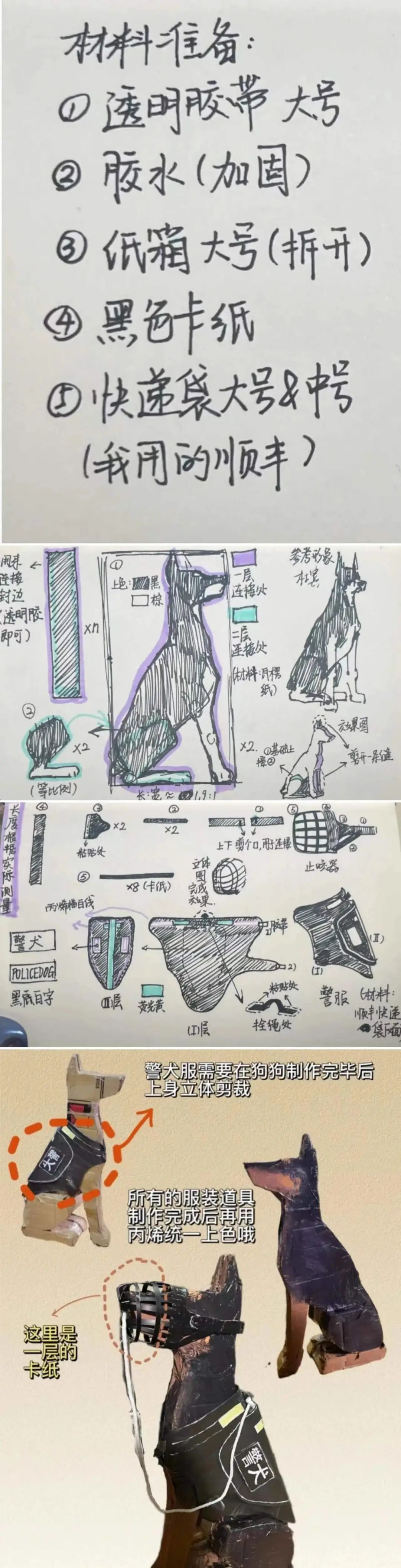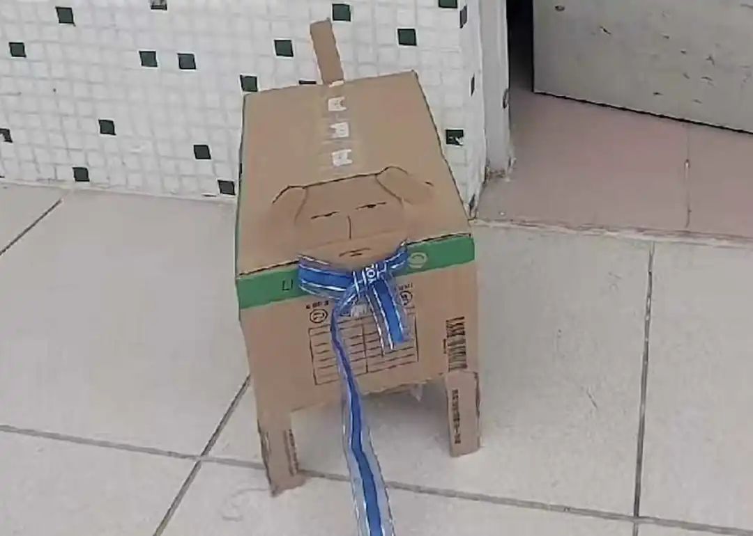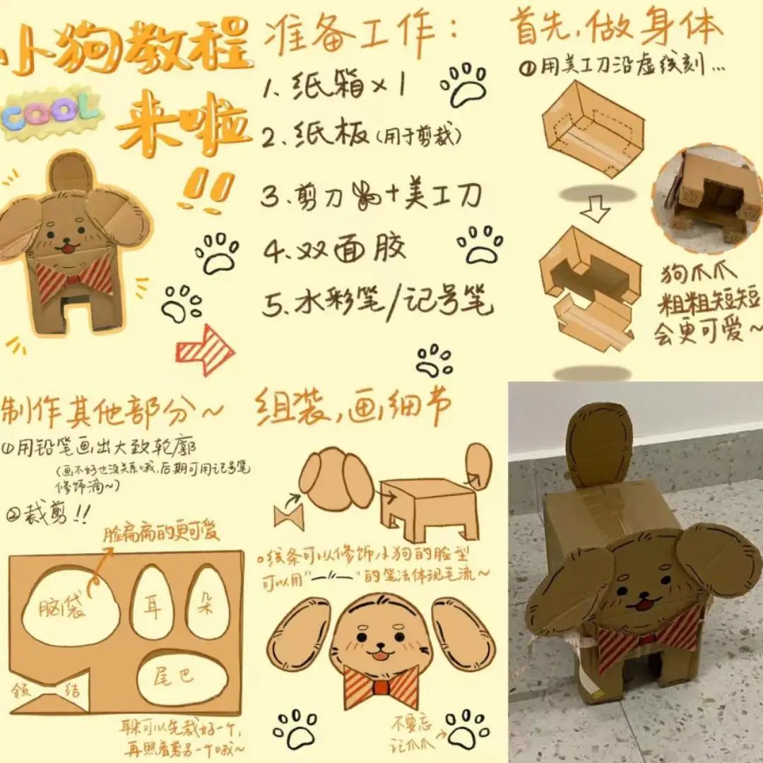 找一个纸箱粘贴牢固,剪掉底部,再画一个狗头和一根狗尾巴分别站在前部和尾部,大功告成。