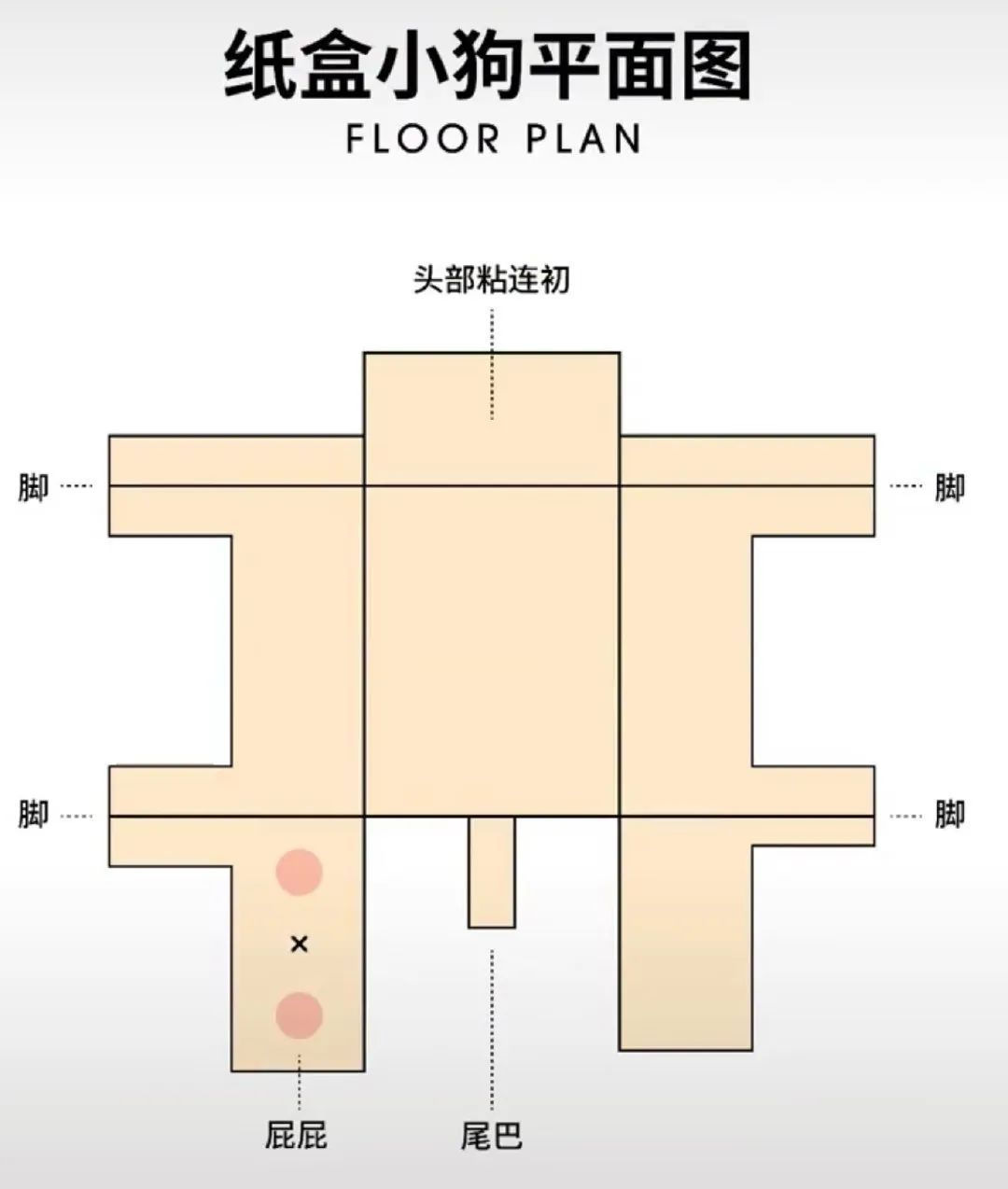 进阶版的小狗需要用一个完整的纸箱,先按照图示裁剪成特定的形状。