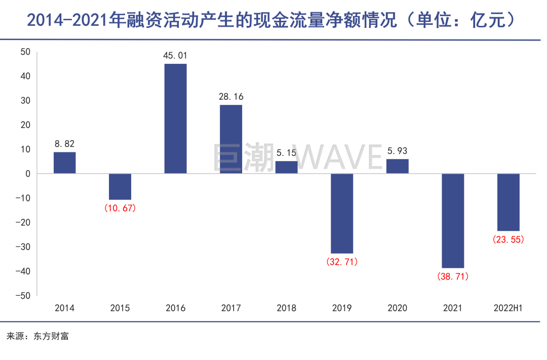 尤其是2021年,融资现金流量净额达到历史最差的-38.71亿元,更糟糕的是,2022年上半年,融资情况丝毫没有好转,为-23.55亿元。这对现在的国美来说,无疑是雪上加霜。
