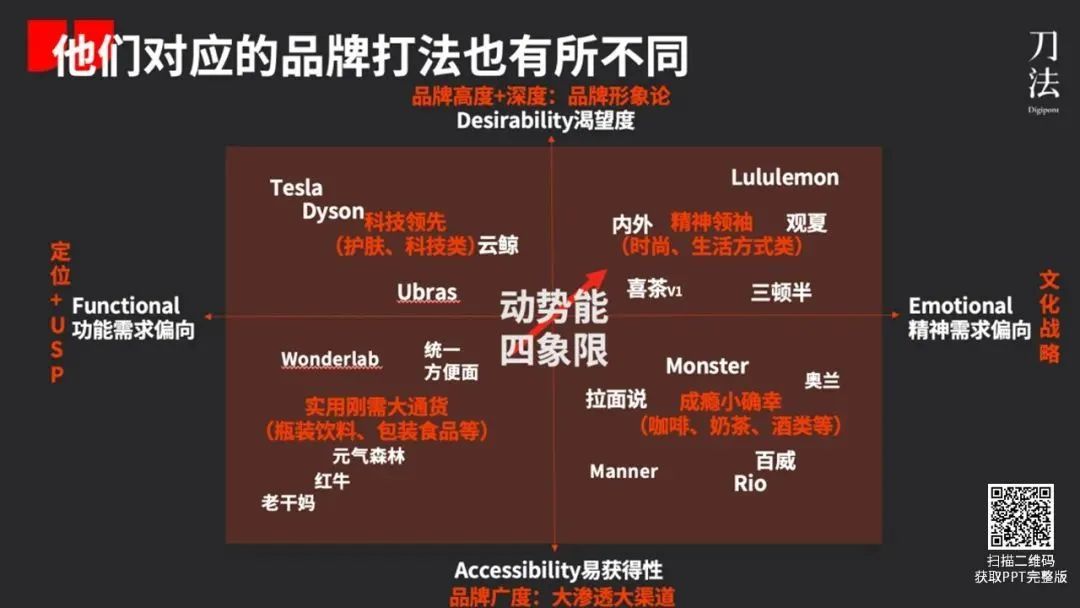 简而言之,势能品牌是“男神”,创造稀缺感和价值感;动能品牌是暖男,底层逻辑是“多快好省”。具体打法上,势能品牌偏向文化战略,强化品牌的精神属性;动能品牌则是大分销、大渗透。动势能打法可以相互结合,但品牌不能失去“根基”。以势能品牌为例,可以做分销扩大规模,但一定要守住“势能大于规模”这个底线,否则容易被反噬。这点钟薛高已经给大家上了一课。